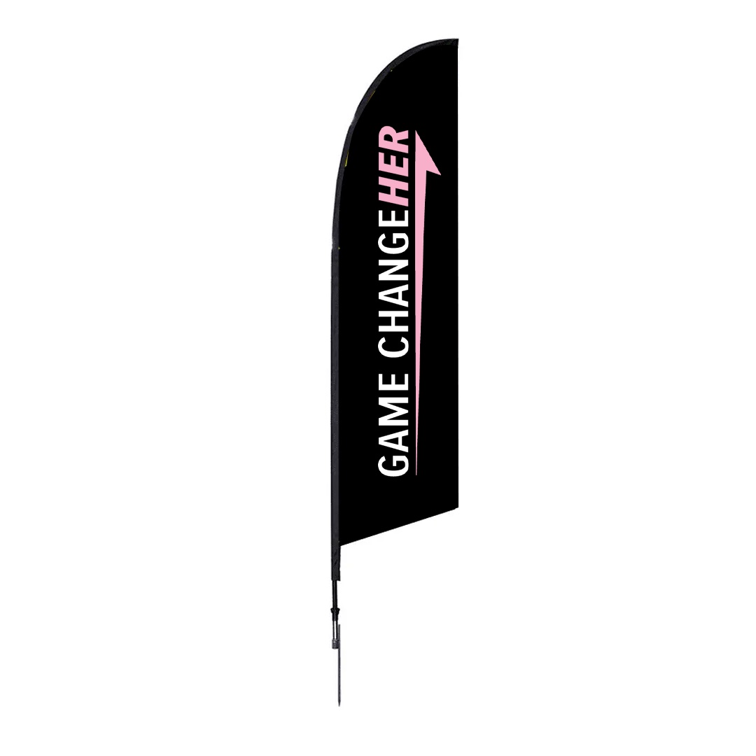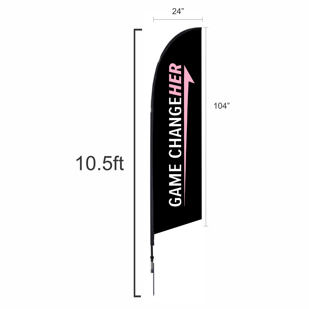 Custom printed on polyester mesh by the process of dye sublimation, inks heavily saturate the material to create a “bleed-through” visual effect for single-sided prints, and double-sided prints are finished with a silver-gray blocker that lays between. Black flag trim is sewn on the graphic for easy pole insertion. A set of grommets installed on lower-trim receives the short bungee cord (included) through its loop and snuggly attaches the graphic to the base. Insert the spike base into the grass.