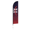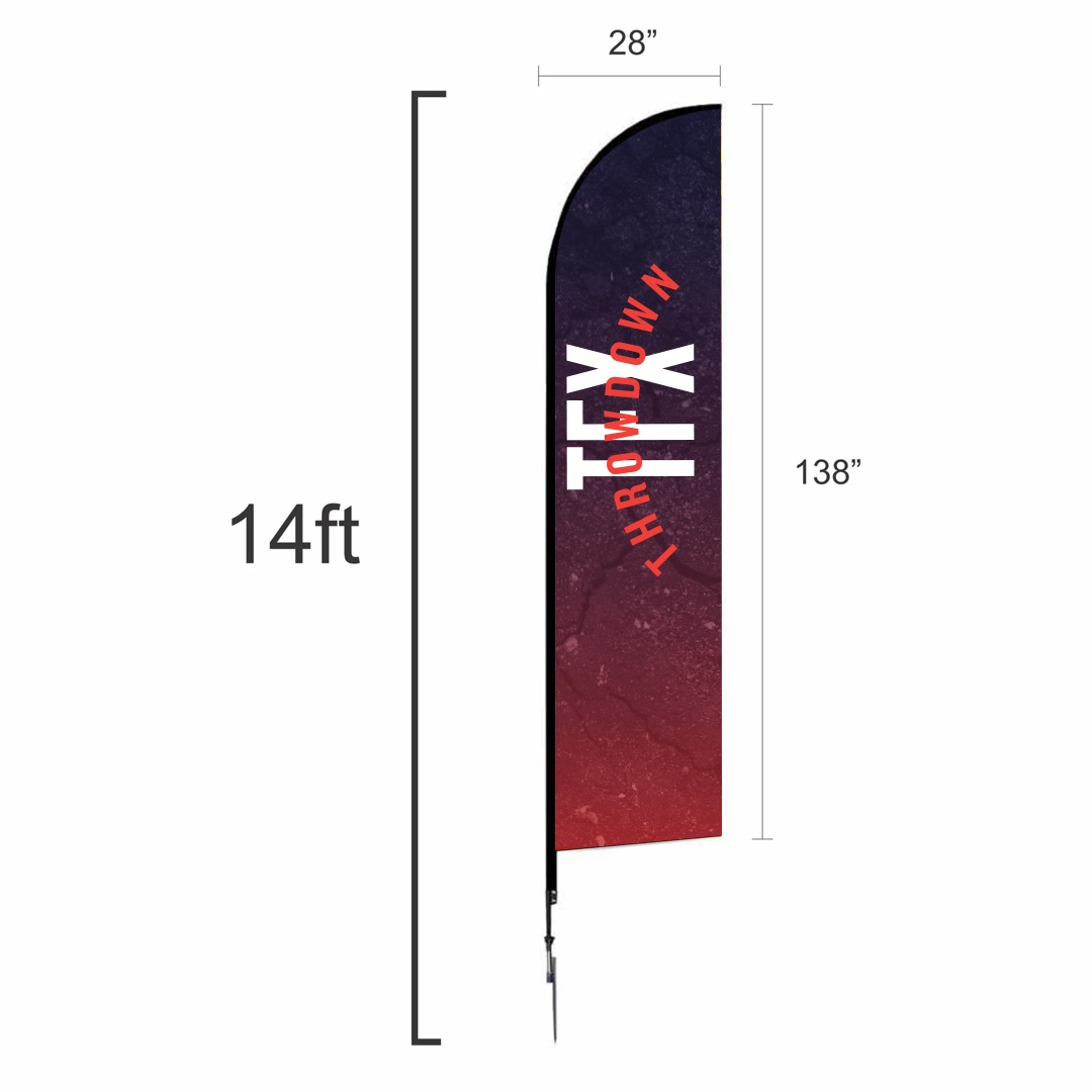 Custom printed on polyester mesh by the process of dye sublimation, inks heavily saturate the material to create a “bleed-through” visual effect for single-sided prints, and double-sided prints are finished with a silver-gray blocker that lays between. Black flag trim is sewn on the graphic for easy pole insertion. A set of grommets installed on lower-trim receives the short bungee cord (included) through its loop and snuggly attaches the graphic to the base. Insert the spike base into the grass.