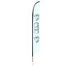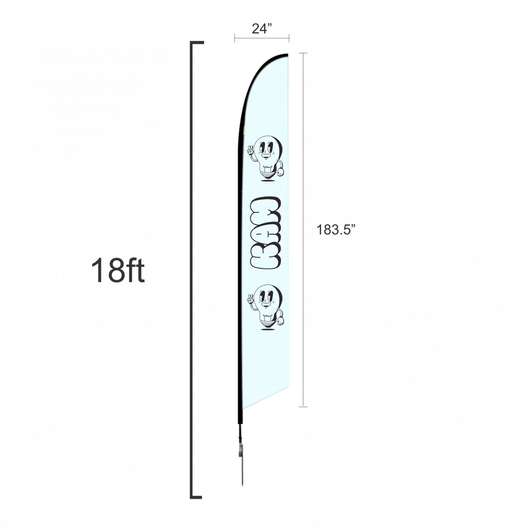 Custom printed on polyester mesh by the process of dye sublimation, inks heavily saturate the material to create “bleed-through” visual effect for single-sided prints, and double-sided prints are finished with a silver-gray blocker that lays between. Black flag trim is sewn on graphic for easy pole insertion. A set of grommets installed on lower trim receives the short bungee cord (included) through its loop and snuggly attaches the graphic to the base. Insert spike base into grass.