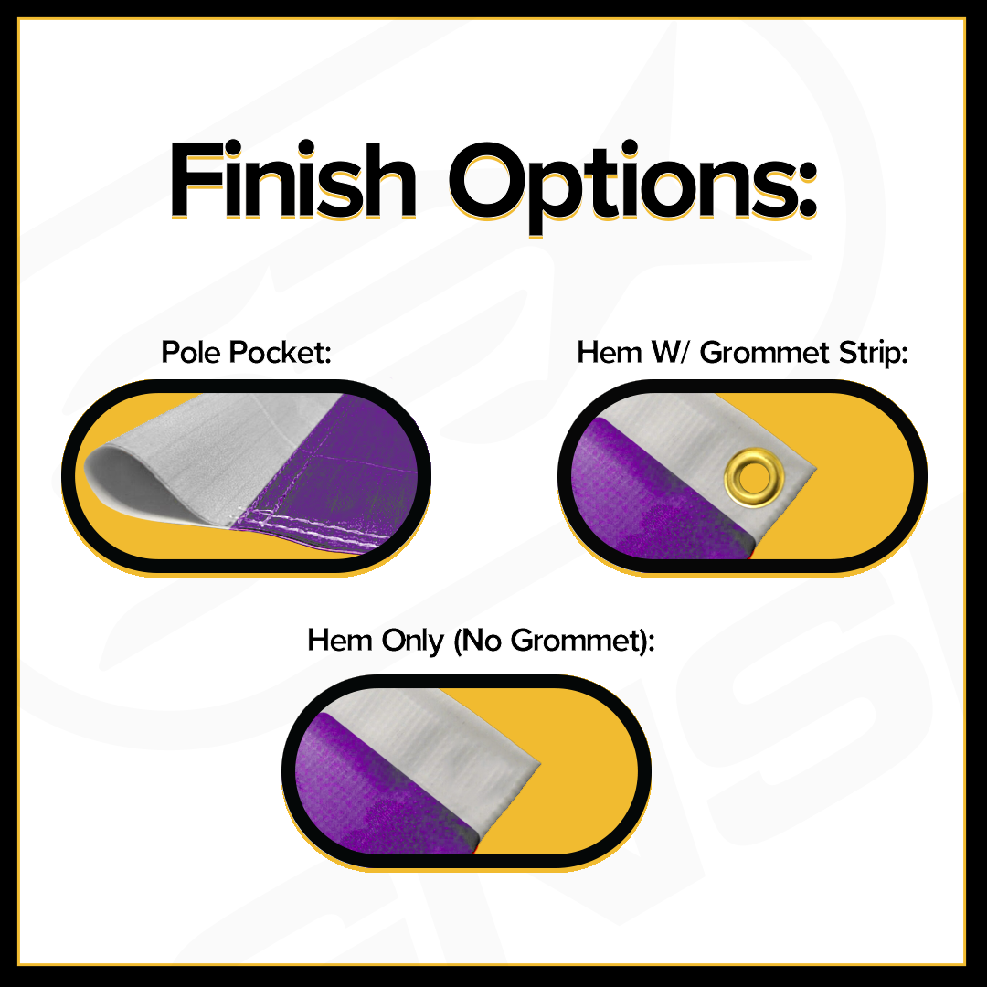 Our custom pole flags can transform your logo or artwork into a dynamic flying reality. Flags are printed with high-quality eco-safe inks through our dye sublimation process. Whether you are flying your flag on a pole or simply hanging it in your room, we offer two types of finishing to accommodate your displaying needs. Please see below for details.