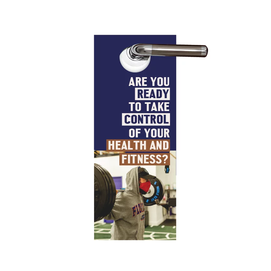- Small Door Hanger Printing: Printed Full Bleed on 100# Gloss Cover with AQ (Gloss Coating) on both sides OR 14pt. Gloss Cover with U.V. (Royal Shiny) on both sides, die cut to 4.25″ x 8.5″ w/ slit &rounded hole on top center.