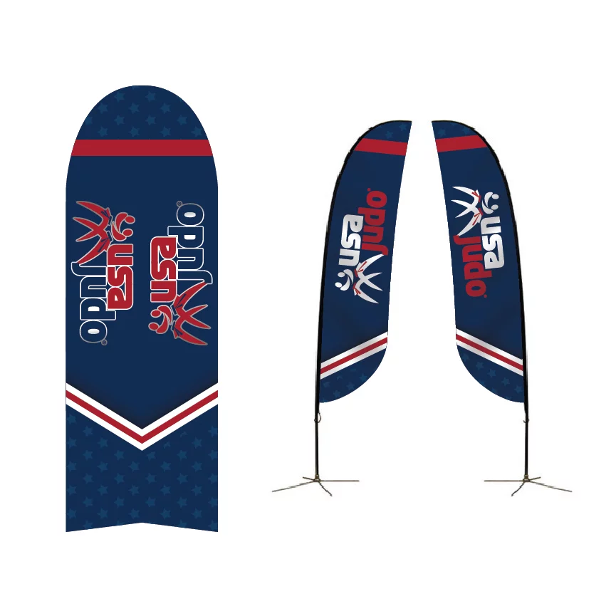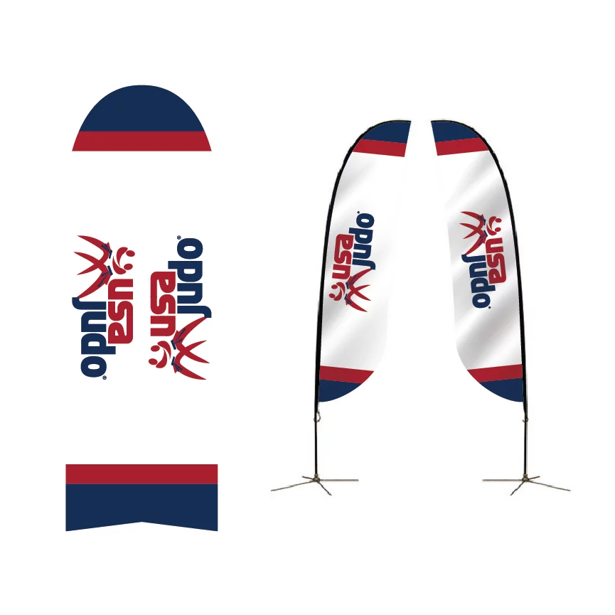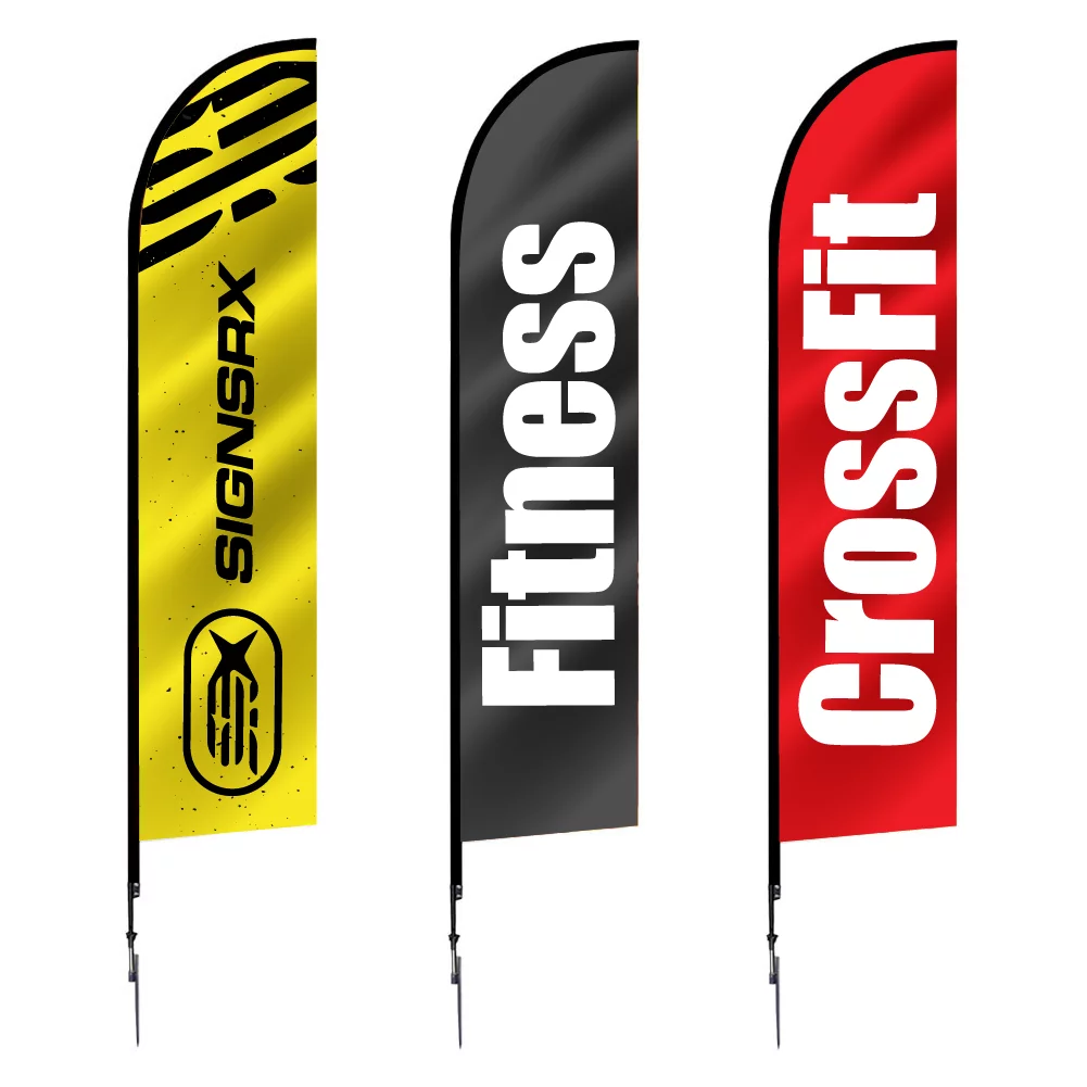 14ft. Large Angled Feather Flag w/Spike Base is a great height for garnering attention outdoors. Custom printed on polyester mesh by the process of dye sublimation, inks heavily saturate the material to create a “bleed-through” visual effect for single-sided prints, and double-sided prints are finished with a silver-gray blocker that lays between. Black flag trim is sewn on the graphic for easy pole insertion. A set of grommets installed on lower-trim receives the short bungee cord (included) through its loop and snuggly attaches the graphic to the base. Insert the spike base into the grass.