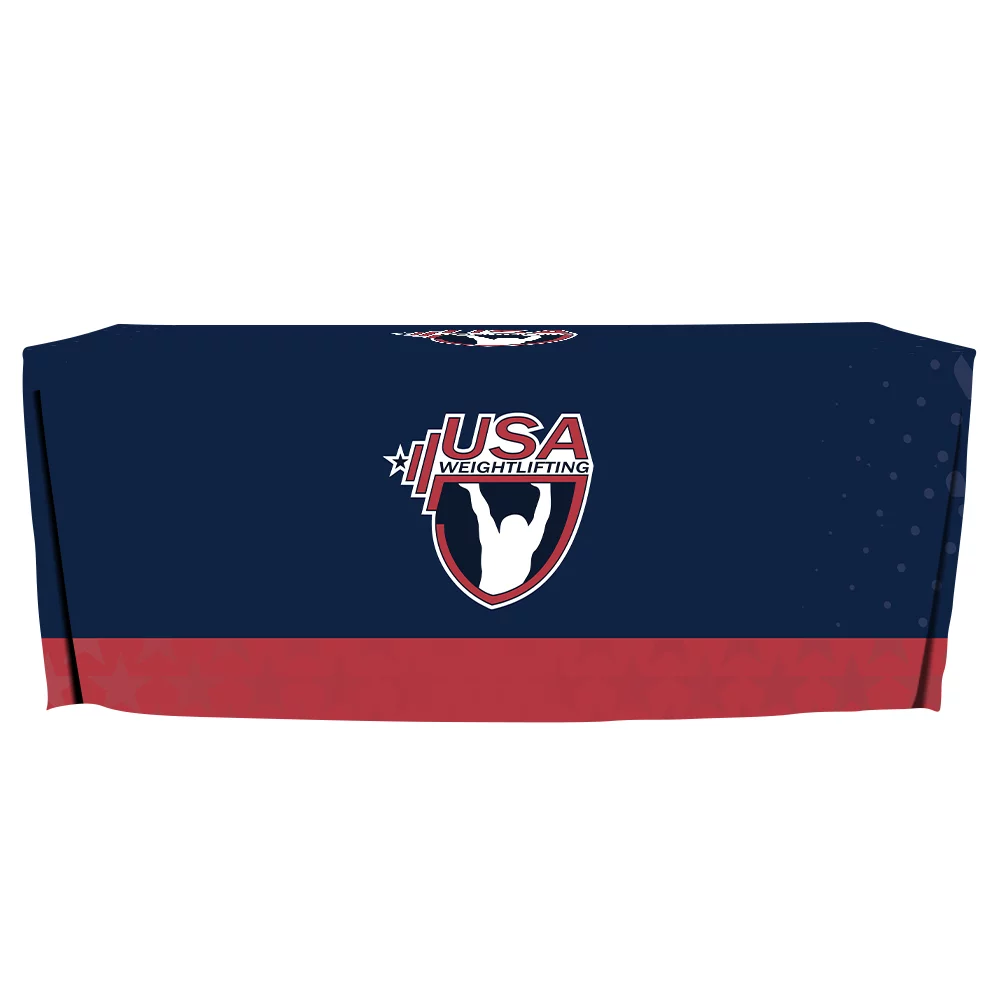 Get your graphic edge-to-edge custom printed on fitted table throw that is made to fit 6 ft. and 8ft tables. This option is 3-sided or 4 sided, fully covering the front and sides of the table or front sides and back of the table.